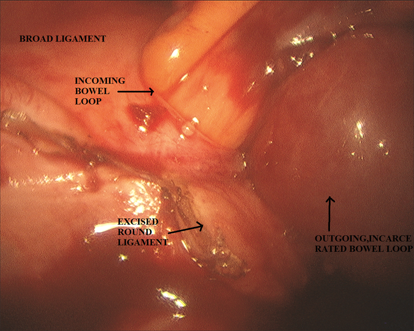 We divided round ligament on the affected side, and bowel loop was pulled out. It appeared pink and viable within a few minutes, thus avoiding resection. We opened the defects on each side by dividing the round ligament, in order to prevent future episodes of bowel migration through these defects.